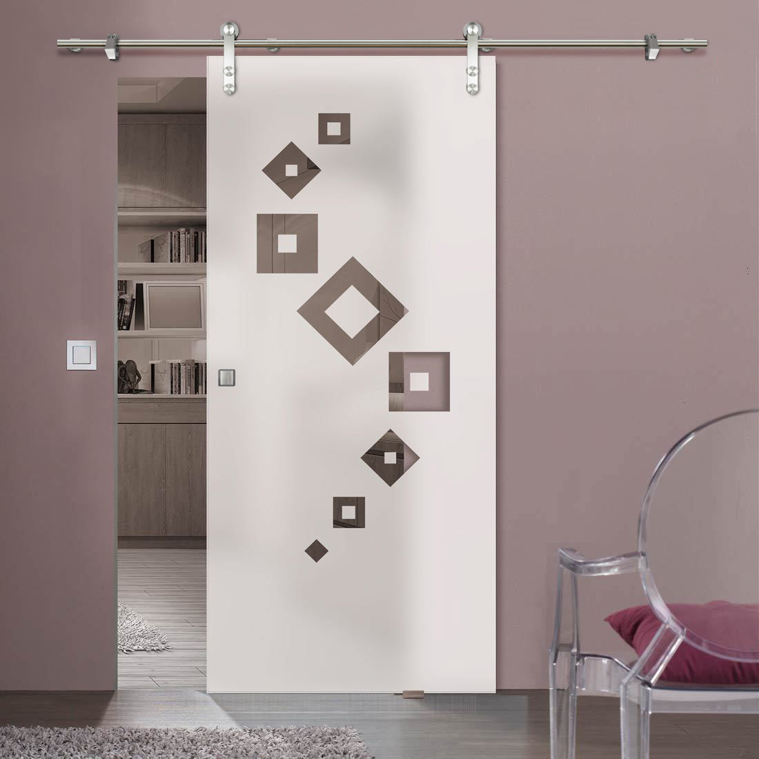 Single Glass Sliding Door - Solaris Tubular Stainless Steel Sliding Track & Geometric Swirl 8mm Obscure Glass - Clear Printed Design