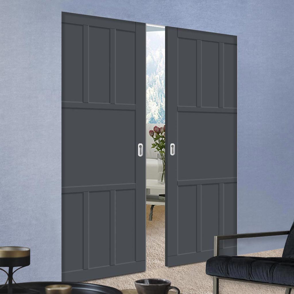 High-quality British made Industrial style double pocket doors made from 40mm thick engineered sustainable solid laminated timber with the warmth that a real wood grained textured door can offer, better than a cold steel feel.