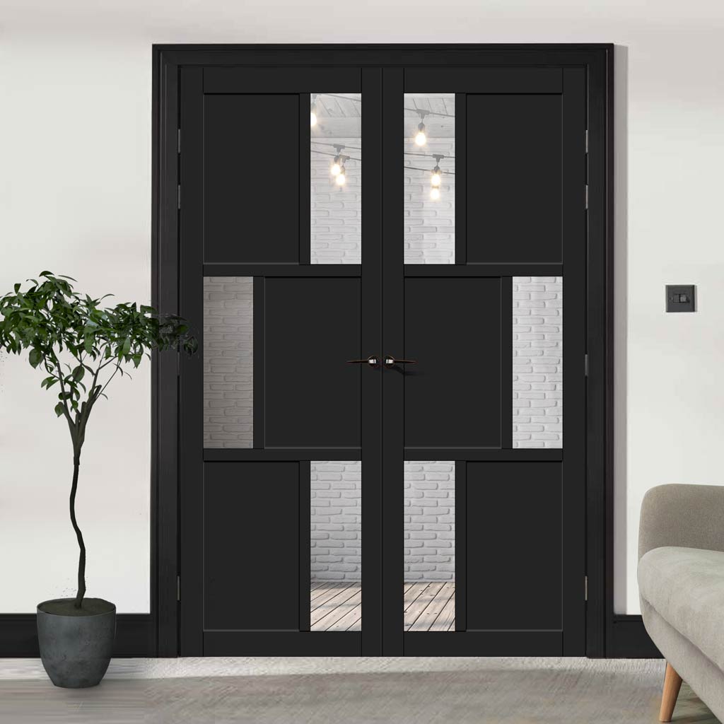 Eco-Urban Tokyo 3 Pane 3 Panel Solid Wood Internal Door Pair UK Made DD6423G Clear Glass - Eco-Urban® Shadow Black Premium Primed