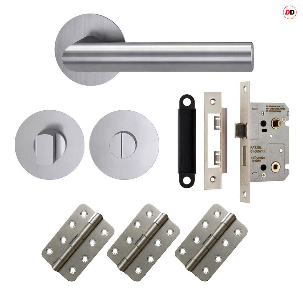 Monroe Door Lever Bathroom Handle Pack - 3 Radius Cornered Hinges - Satin Stainless Steel