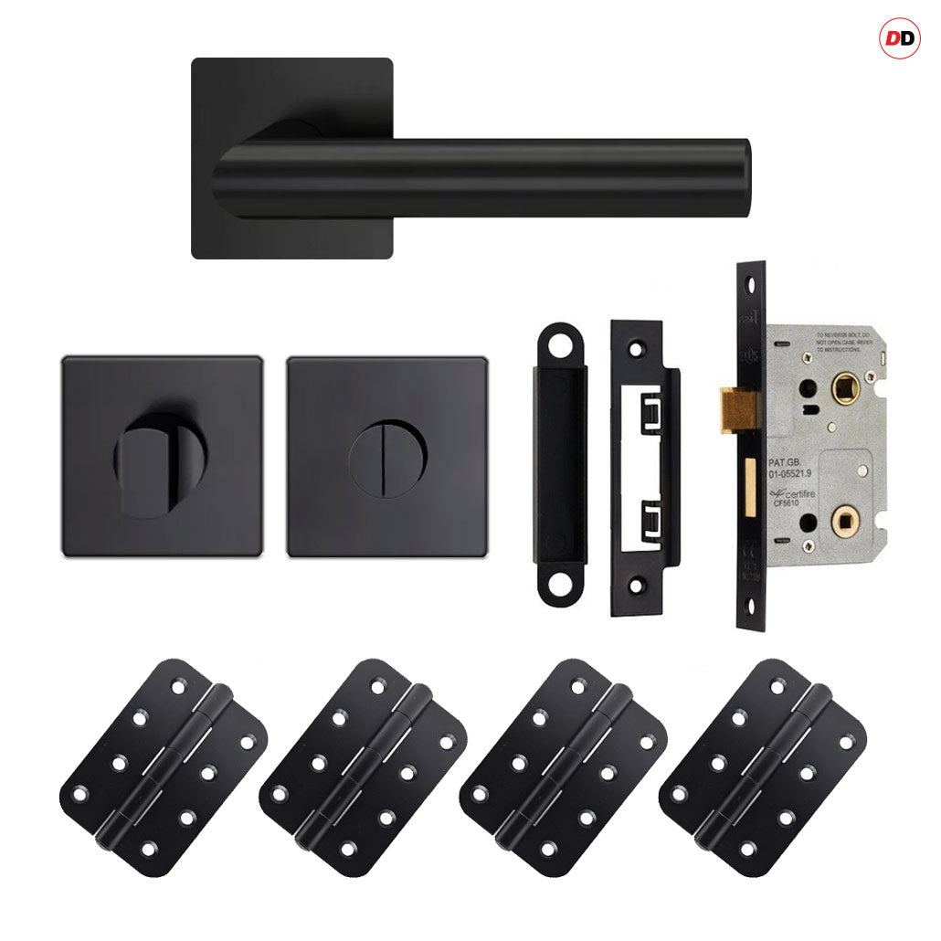 Orlando Door Lever Bathroom Handle Pack - 4 Radius Cornered Hinges - Matt Black