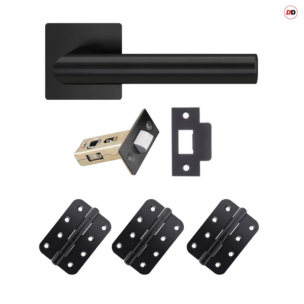 Orlando Door Lever Handle Pack - 3 Radius Cornered Hinges - Matt Black