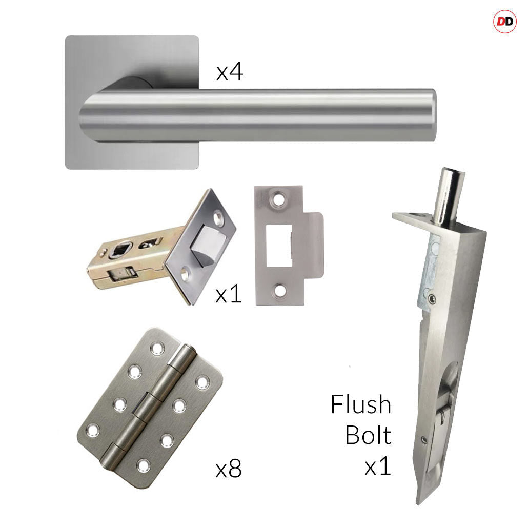 We include two pairs of handles, one latch, *one flush slipbolt and six complimentary hinges, the hinges will be the nearest available colour match for the handles as will the lock/latch.