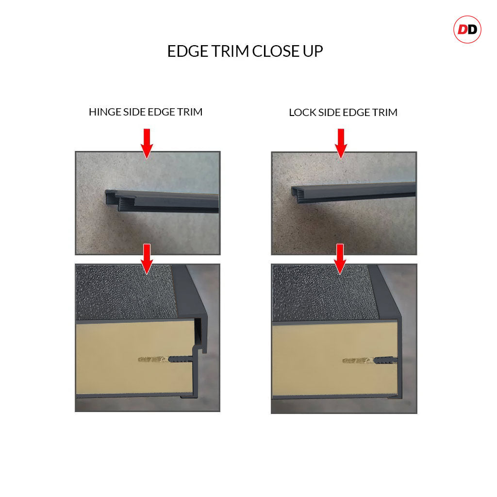 Please see edge trim close up image, these are removable to allow for minimal door adjustment prior to refitting these edges.