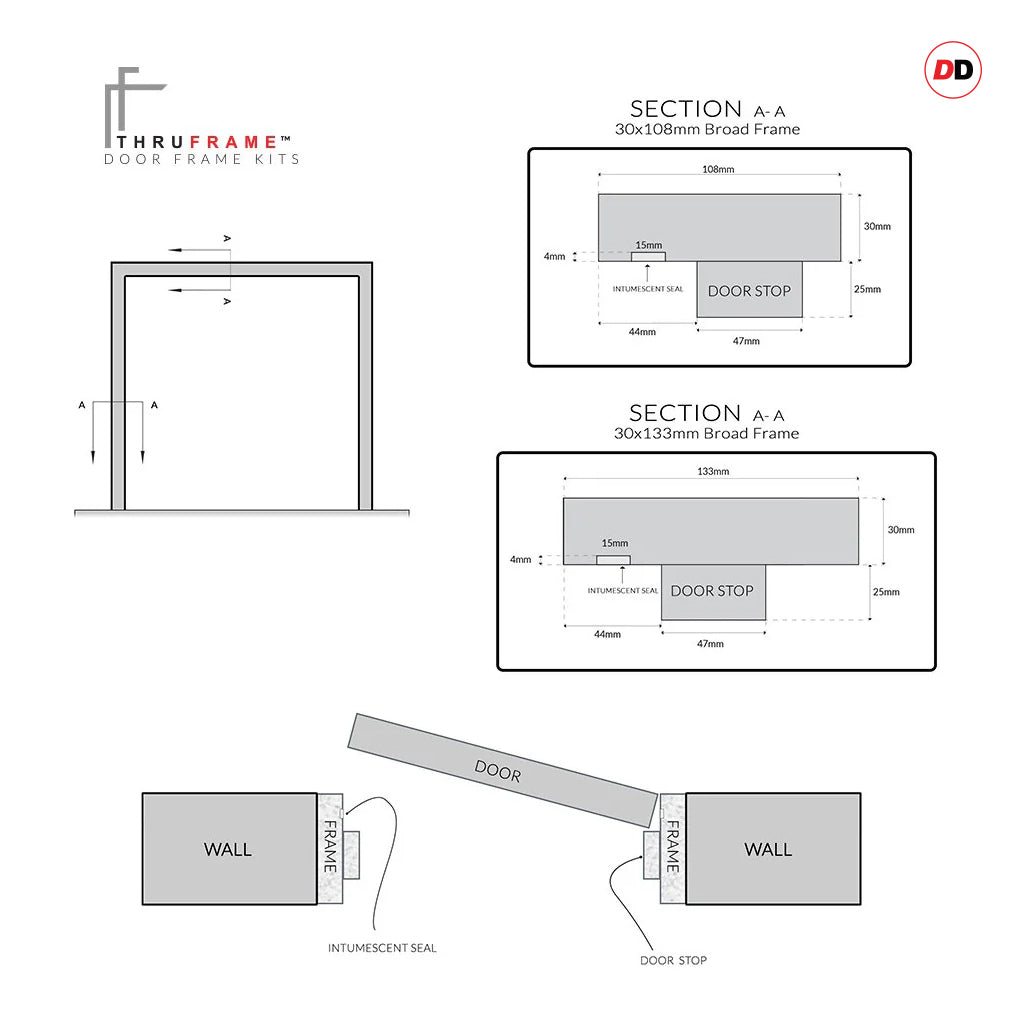 Thruframe Door Lining Frame Kits are 94x30mm, 108x30mm or 133x30mm thick and are mainly used where there is a solid wall, timber stud style partition wall or a robust wall to give extra stability, the price is per 6 piece pack frame legs and lintol and including 3 door stops amd the 3 pieces of intumescent seals, to suit one doorway, sold in kit form.