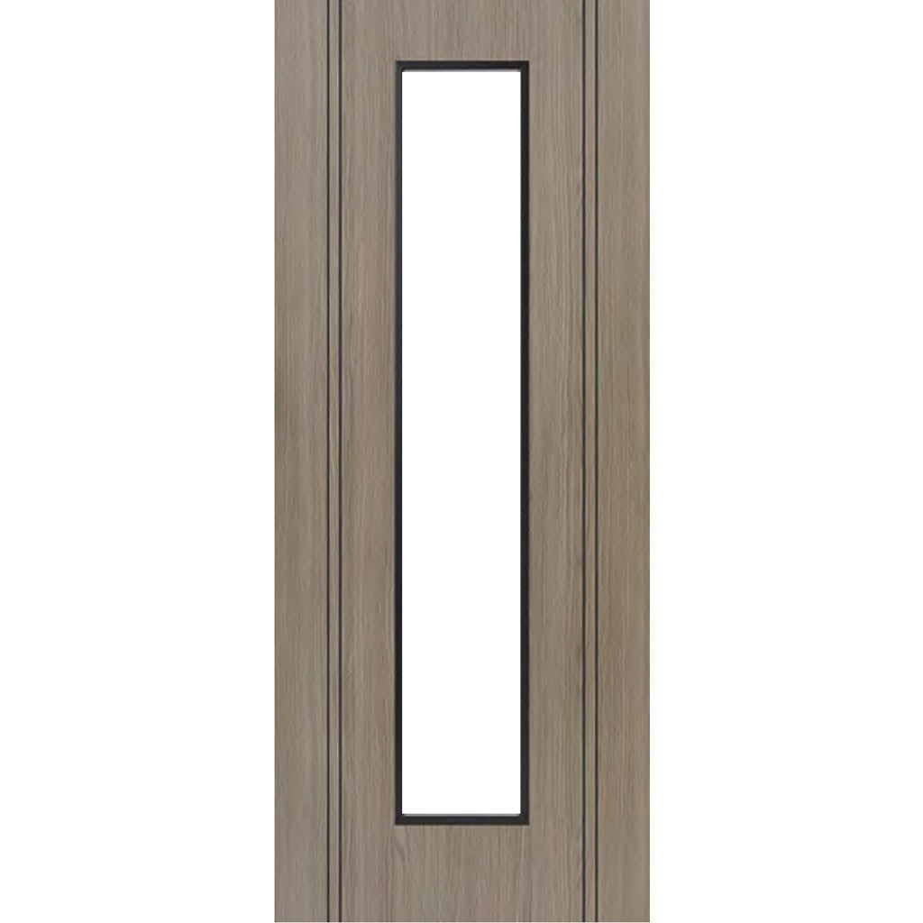 Top Mounted Black Sliding Track & Door - Monaco Flush Light Grey Internal Door with Contrasting Lines - Clear Glass - Laminated