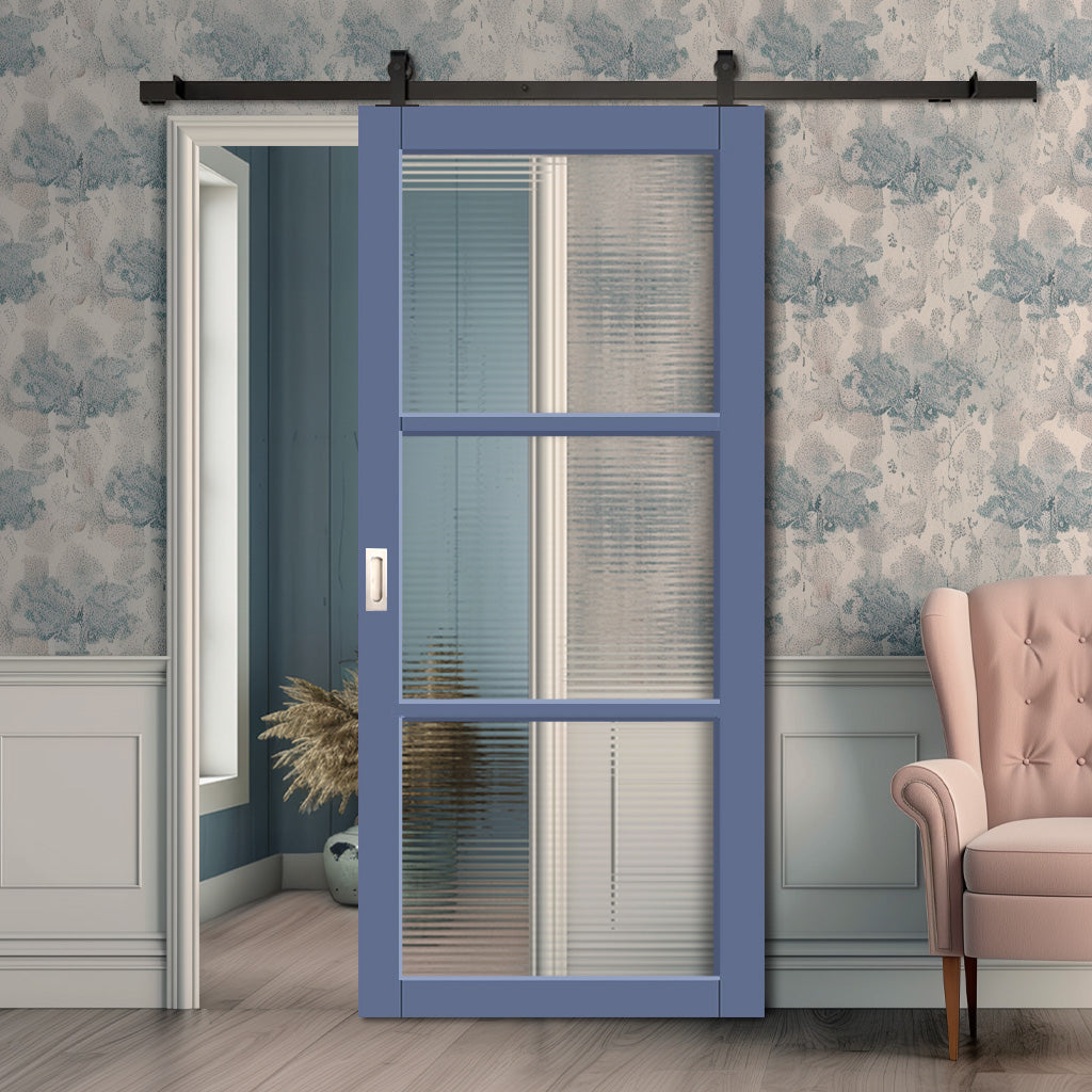 Top Mounted Black Sliding Track & Solid Wood Door - Handcrafted Eco-Urban Manchester 3 Pane Solid Wood Door DD6306 - Clear Reeded Glass - Heather Blue Premium Primed
