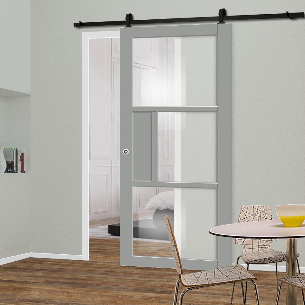 Top Mounted Black Sliding Track & Solid Wood Door - Eco-Urban® Breda 3 Pane 1 Panel Solid Wood Door DD6439G Clear Glass - Mist Grey Premium Primed