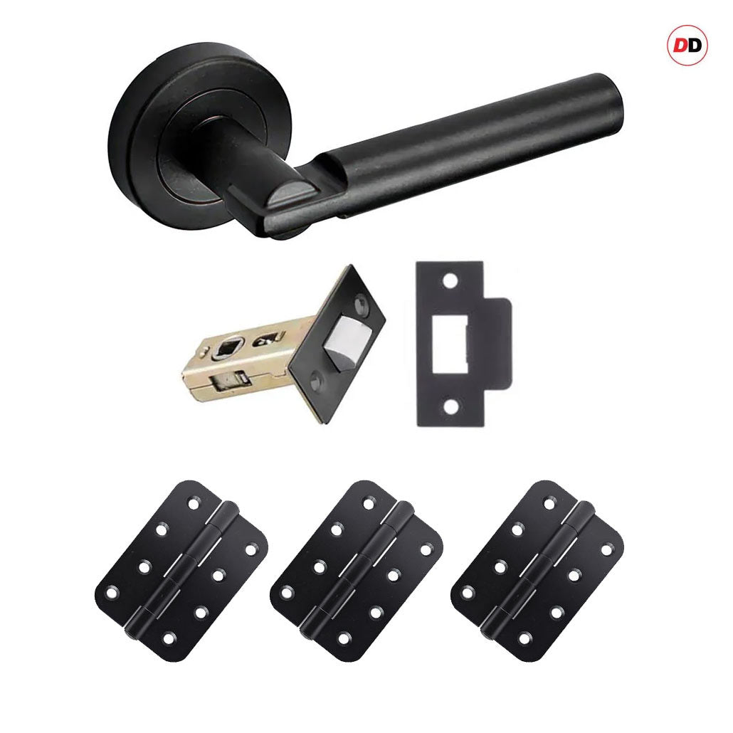 Turin Door Lever Handle Pack - 3 Radius Cornered Hinges - Matt Black