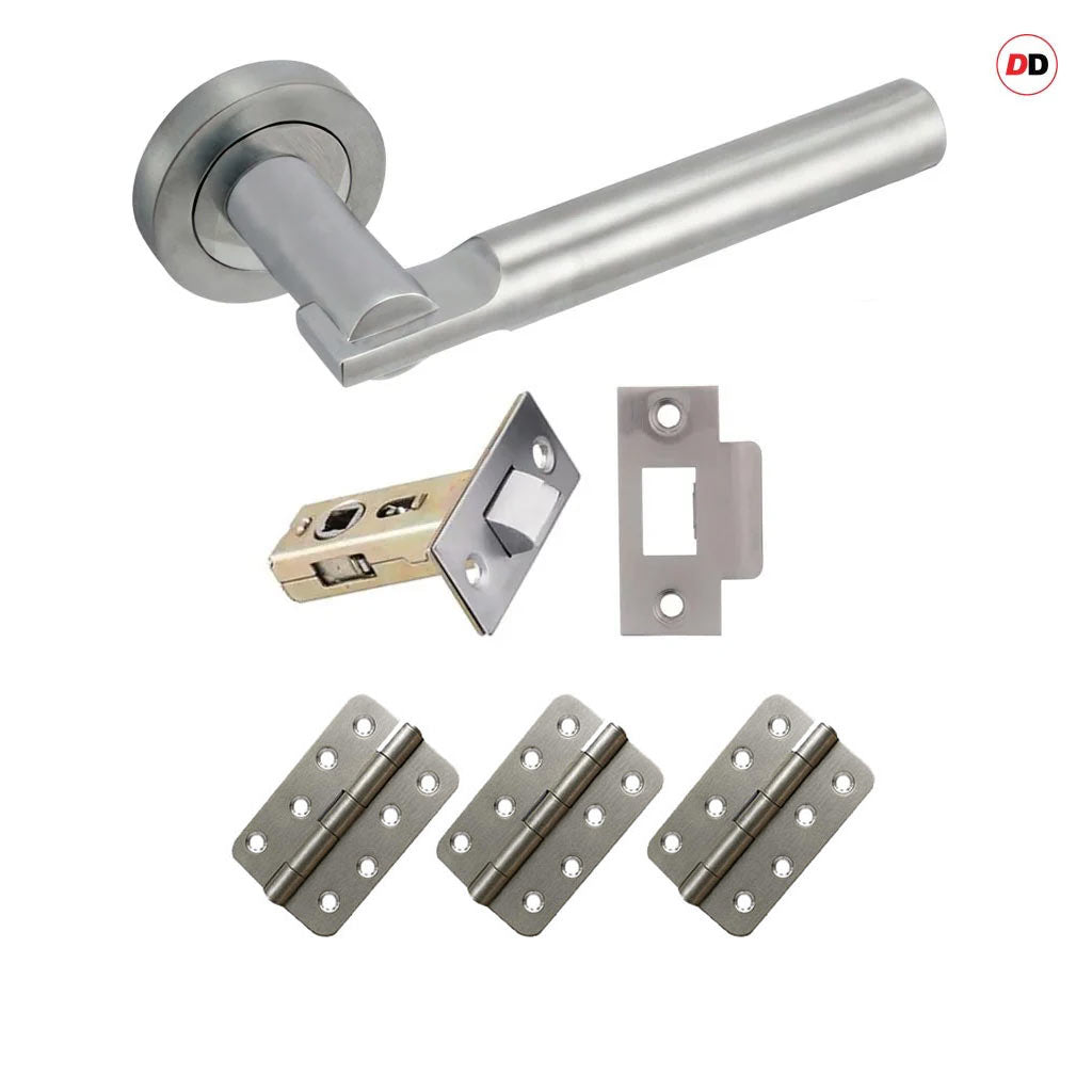 Turin Door Lever Handle Pack - 3 Radius Cornered Hinges - Satin Finish