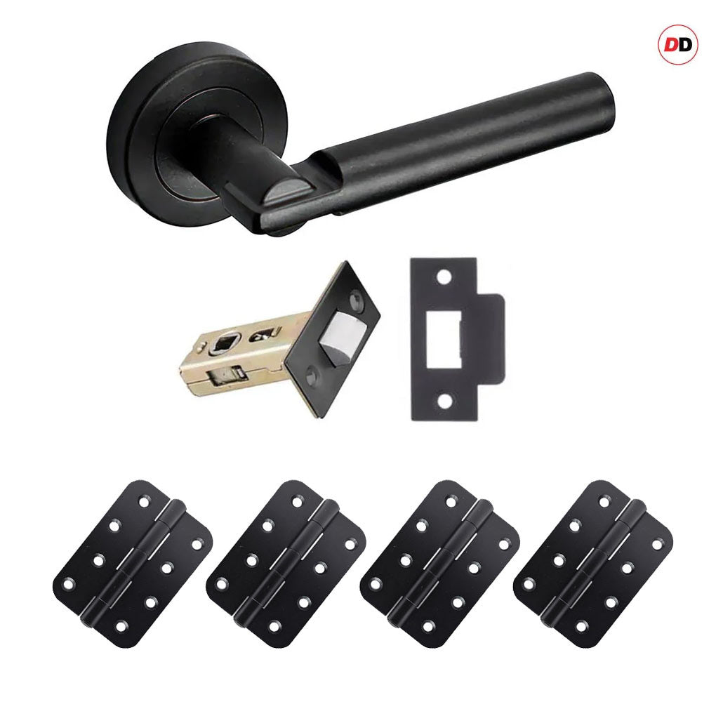 Turin Door Lever Handle Pack - 4 Radius Cornered Hinges - Matt Black