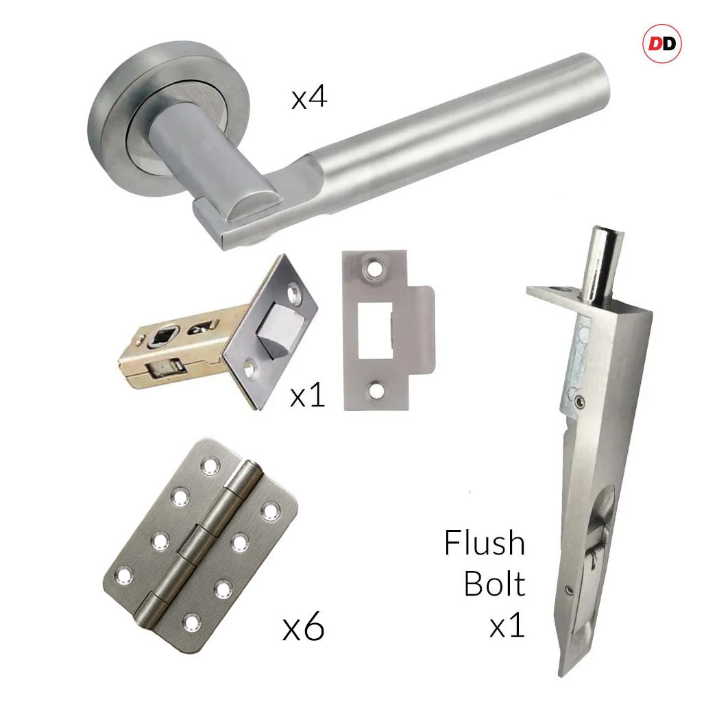 Turin Double Door Lever Handle Pack - 6 Radius Cornered Hinges - Satin Finish - Combo Handle and Accessory Pack